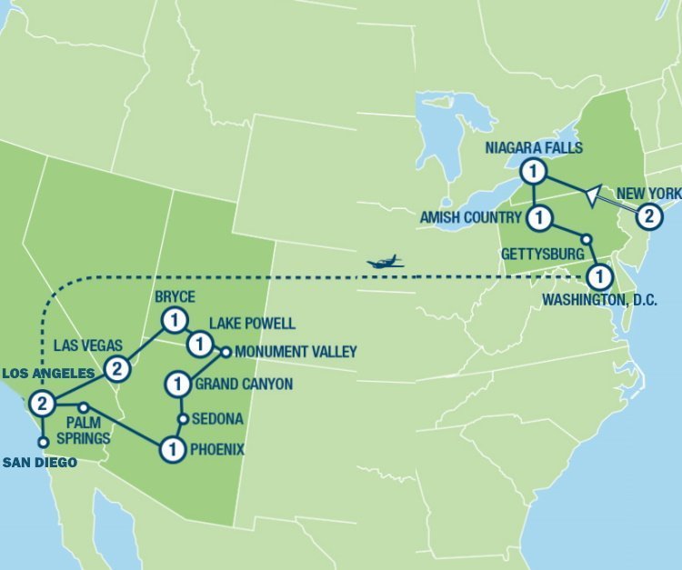 Een combinatiereis waarbij u in circa 2 weken tijd de hoogtepunten van zowel de oostkust alsmede de westkust van Amerika te zien krijgt! Deze zeer afwisselende rondreis per touringcar start in de ‘Big Apple’. Een mooie rit door prachtige natuur brengt u naar de beroemde Niagara Watervallen. U beleeft onderweg de opvallende leefwijze van de Amish-gemeenschap. Vervolgens vliegt u ‘Coast to Coast’ van Washington D.C. naar Los Angeles. Na een bezoek aan San Diego ziet u in korte tijd 4 bekende Nationale Parken in het westen van Amerika, namelijk Grand Canyon, Monument Valley, Bryce Canyon en Zion. De reis eindigt in het grootste gokparadijs van Amerika: Las Vegas.