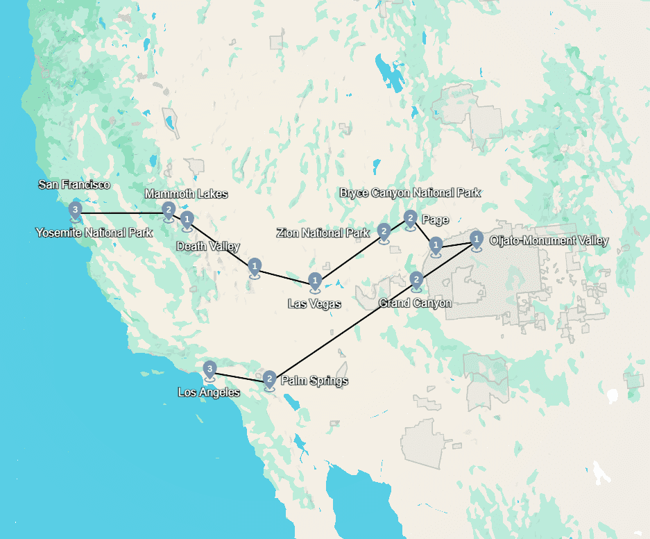 Deze reis begint in San Francisco en volgt een route langs nationale parken, bijzondere landschappen en grote steden in het westen van de Verenigde Staten. U bezoekt onder meer Yosemite, Mammoth Lakes, Death Valley en Las Vegas. Daarna volgt een reeks indrukwekkende parken: Zion, Bryce Canyon, Page, Monument Valley en de Grand Canyon. Via Palm Springs eindigt de reis in Los Angeles. U verblijft in unieke accommodaties die dicht bij de belangrijkste bezienswaardigheden liggen, zodat u optimaal kunt genieten van de natuur en de steden zonder lange reistijden.