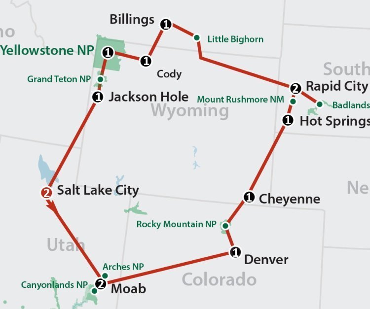 Ontdek bij deze rondreis de gebieden van het wilde westen. De reis start vanuit Salt Lake City. U bezoekt eerst Canyonlands National Park en Arches National Park. Hierna bezoekt u Denver. Vervolgens rijdt u noordwaarts door Cowboy Country. Aanschouw de Black Hills van South Dakota, ooit de woonplaats van de Sioux Indianen. Overnacht in Jackson Hole, een plek waar vroeg bont werd verruild. Het hoogtepunt van de reis is voor het laatst bewaard: de beroemde geisers van Yellowstone National Park. Via Jackson Hole keert u weer terug naar Salt Lake City.